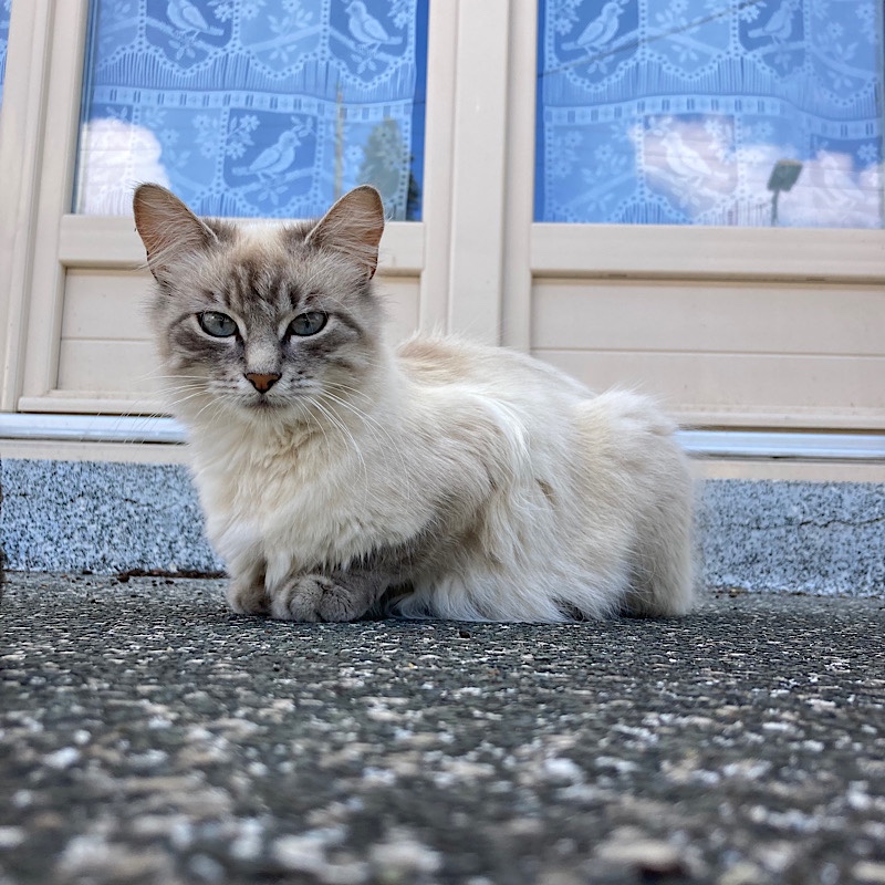 Au village suivant (Château-du-Loir), je dégote une boulangerie pour moi aussi butiner mon repas. La boulangère est super gentille, elle remplit mes bidons avec de l’eau bien fraîche. Dehors, je mange un morceau du sandwich que je viens d’acheter, sous le regard curieux et en même temps condescendant d’un Sacré de Birmanie.