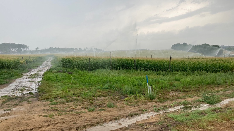 Alors qu’il continue de pleuvoir, je longe un champ de maïs. Et alors je ne sais pas vous mais je trouve un peu bizarre d’arroser du maïs alors qu’il pleut.