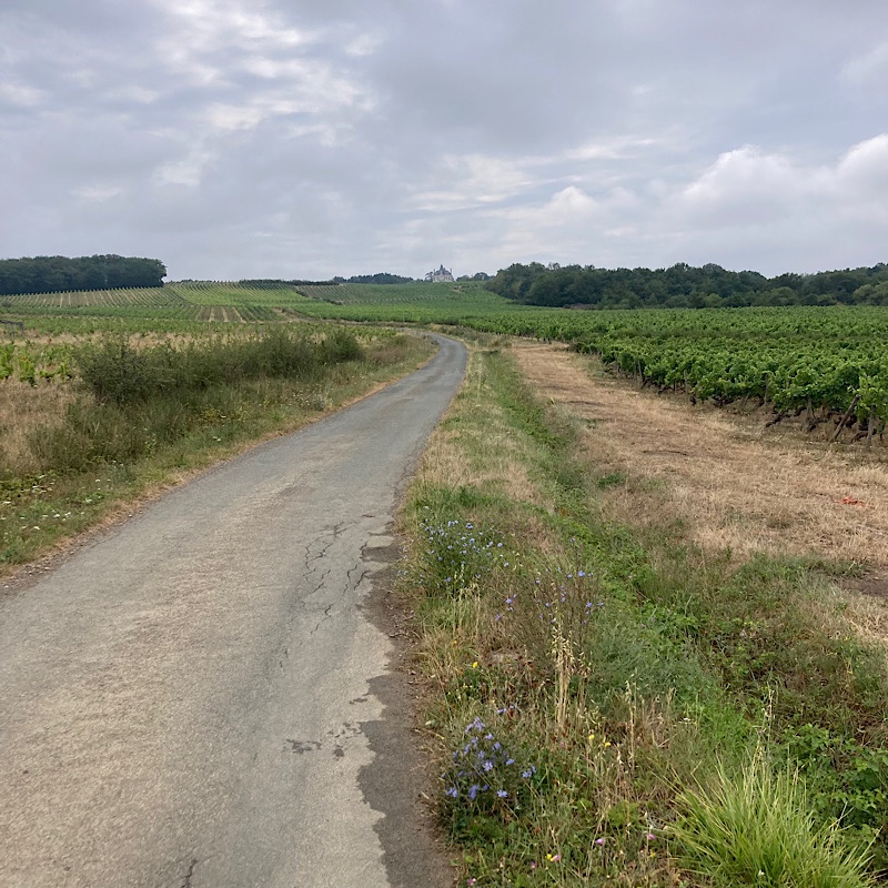 Derniers kilomètres à travers des vignobles. Une question me vient : ici c’est la rive gauche de la Loire, que font des vignobles orientés au nord ?