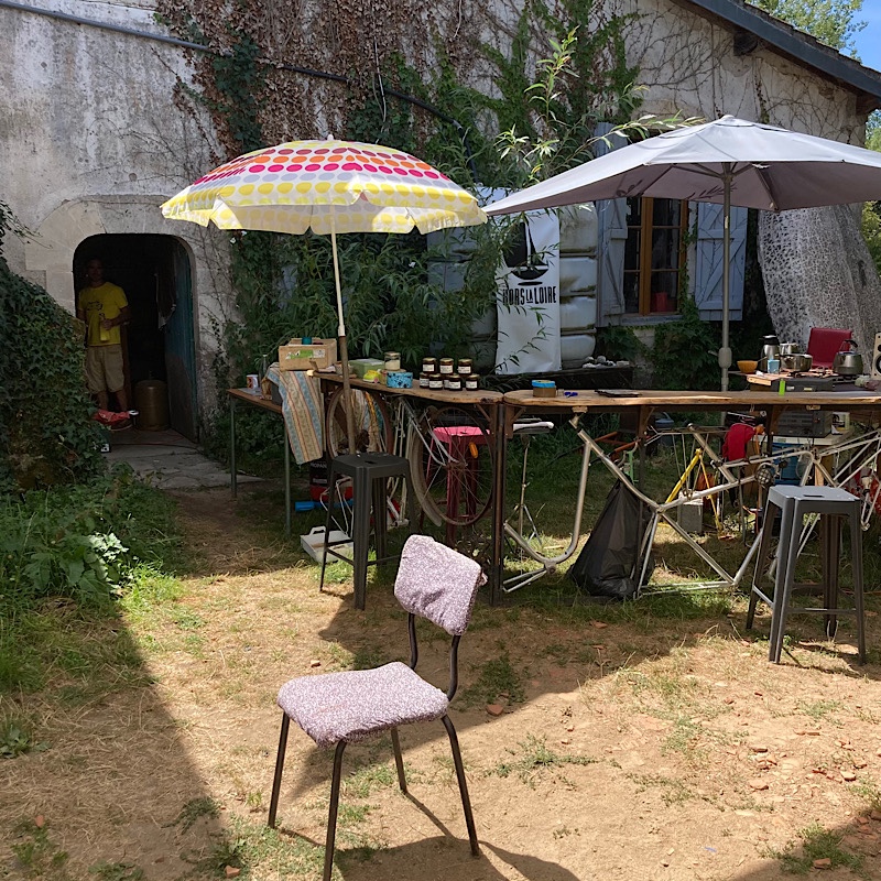 Au milieu de l’après-midi, je fais une petite pause dans un atelier participatif de réparation vélo pour regonfler un peu mes pneus. C’est la caverne d’Ali-Baba ici, mais je trouve une pompe asthmatique qui peine à rajouter quelques dixièmes de bars dans mes roues.