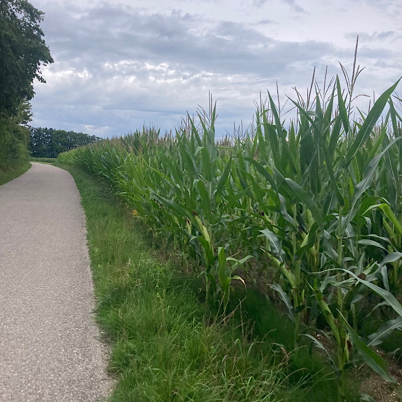 Après Pfaffenhofen, je longe une route bordée de champs de maïs, et je finis à Reichertshausen, chez Christine, en airbnb.