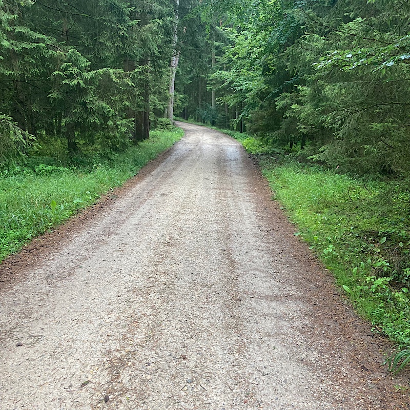 Bref. Je continue, sauf que la route est devenue bien plus passante. Comme sur ma carte la forêt est striée de chemins, j’en tente un et c’est bien amusant, même si je transforme mon vélo en tas de boue. Ça va aussi beaucoup moins vite, donc dès que possible, je retourne à la route, car il me reste un paquet de kilomètres.