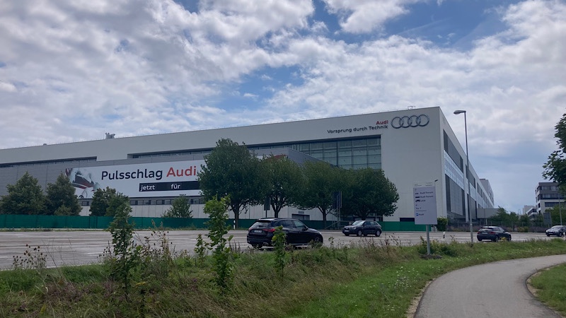 Dernière ligne droite avant Ingolstadt : une longue descente au milieu des arbres. Quelques kilomètres de plat, et doucement je m’approche d’un gros bâtiment gris orné de quatre anneaux : c’est l’usine Audi. C’est gigantesque.