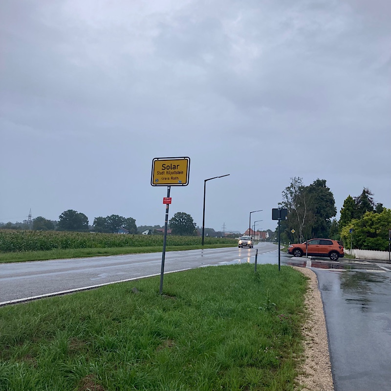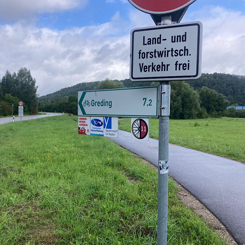 Cependant, alors que je commence à suivre une rivière, la (le ?) Thalach, la pluie s’estompe, et au village suivant, Greding, le ciel bleu fait son apparition.