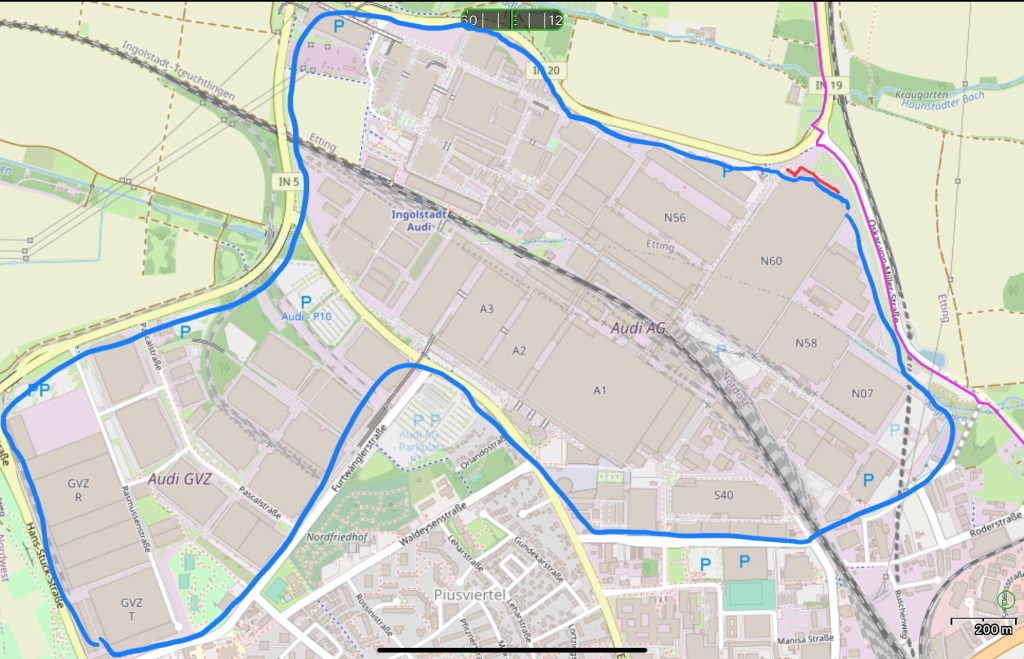 En violet, mon itinéraire ; en bleu, l’usine Audi ; en rouge, ce qu’on voit sur la photo ci-dessus