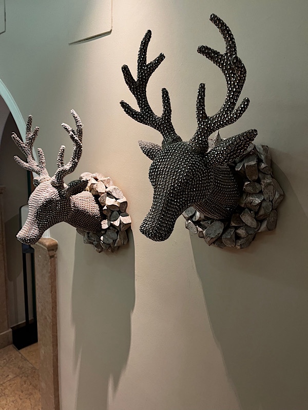 J’ai noté qu’à l’hôtel, pour aller de notre chambre à la salle à manger, il faut passer par un couloir qui n’est pas sans rappeler un pavillon de chasse qui serait excessivement bling-bling.