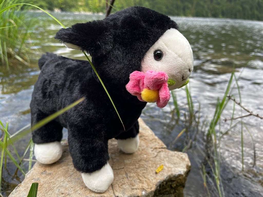 Nous marchons un peu, puis retour à St Wolfgang, où j’achète une carte postale et une brebis en peluche pour Grogu. Puis on va faire une petite rando autour du Schwarzensee, un lac à quelques kilomètres. La brebis de Grogu nous accompagne et mâchouille des fleurs trouvées sur le chemin.