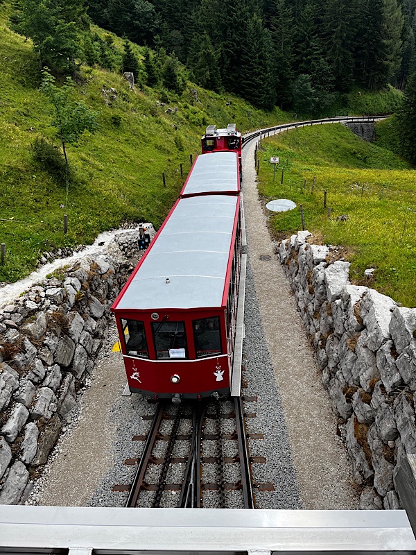 Au sommet du Schafberg, à plus de 1700m d’altitude, on y voit comme à travers une pelle : des nuages coiffent la montagne, et ça caille. Nous décidons vite fait de redescendre à la gare précédente, à 810m, sous les nuages.
