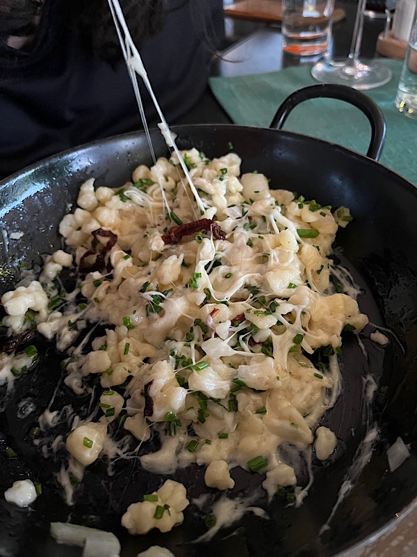 Les spätzles c’est une sorte de petites pâtes qui rappellent un peu les crozets, mais c’est surtout dû au fait qu’ils sont servis dans une mer de fromage fondu. Pour moi, manger ça au milieu de ces montagnes qui ressemblent aux Alpes du Nord, c’est un peu une madeleine de Proust (un makroud de Pierre Assouline si vous êtes séfarade).