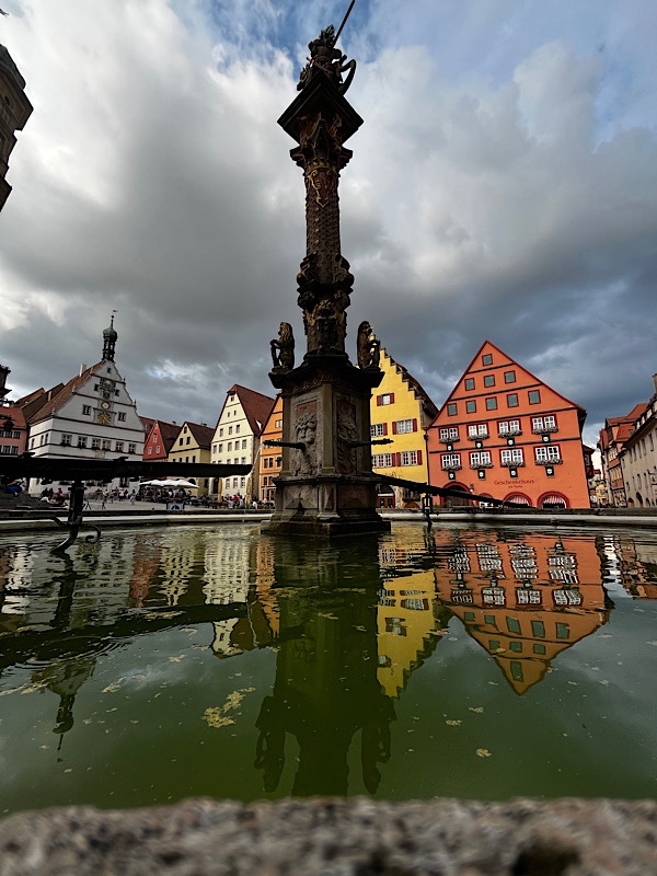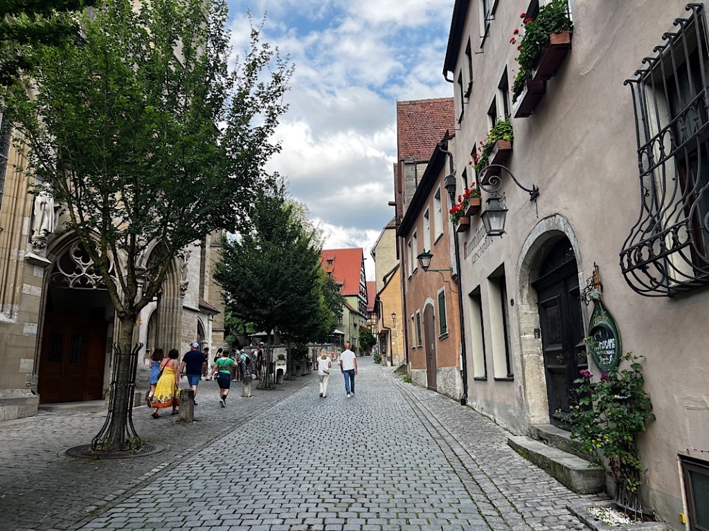 Dimanche 21 juillet, nous voilà partis en voiture pour l’Allemagne, pour faire une pause en chemin. Nous avons réservé un hôtel à Rothenburg op der Tauber, dans le nord de la Bavière. Je connais l’endroit : j’y suis passé à vélo l’an dernier, lors d’une journée bien humide. Ça me fait plaisir de repasser par là et la météo est bien plus clémente.