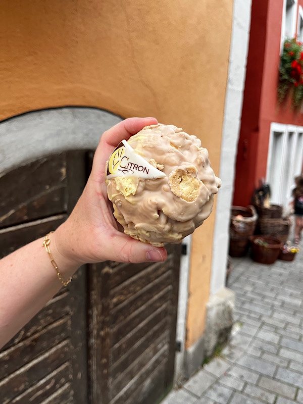Dans la rue, nous goûtons un Schneeball (“boule de neige” en allemand), pâtisserie typique du coin. C’est intéressant à découvrir mais Bo-Katan et moi nous nous accordons sur le fait que le goût correspond à l’apparence.