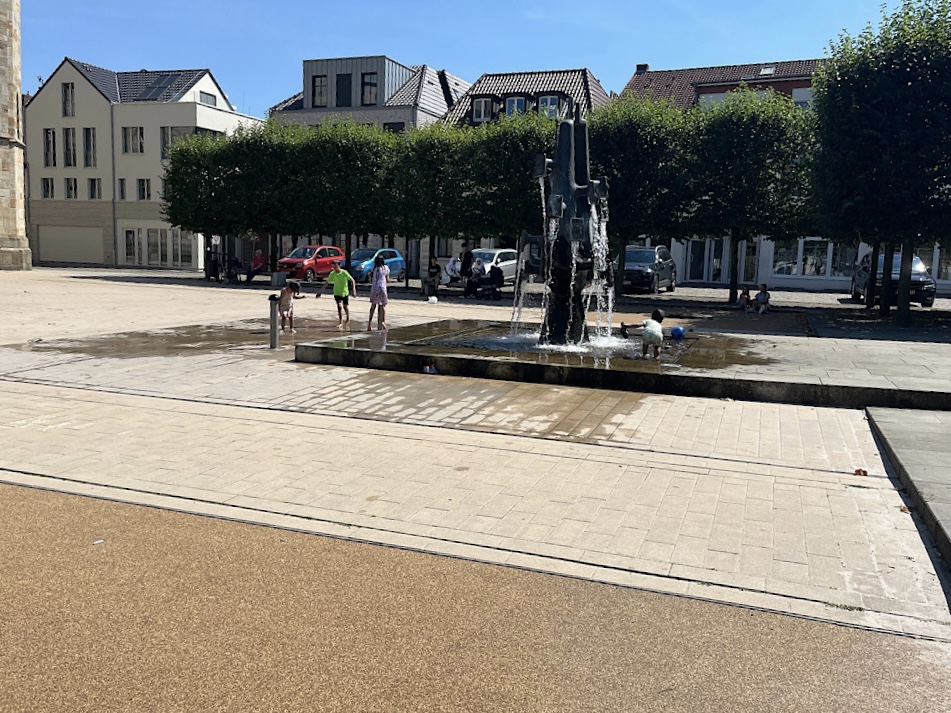Puis je repars. Devant l’église de la ville, des enfants jouent dans une fontaine.