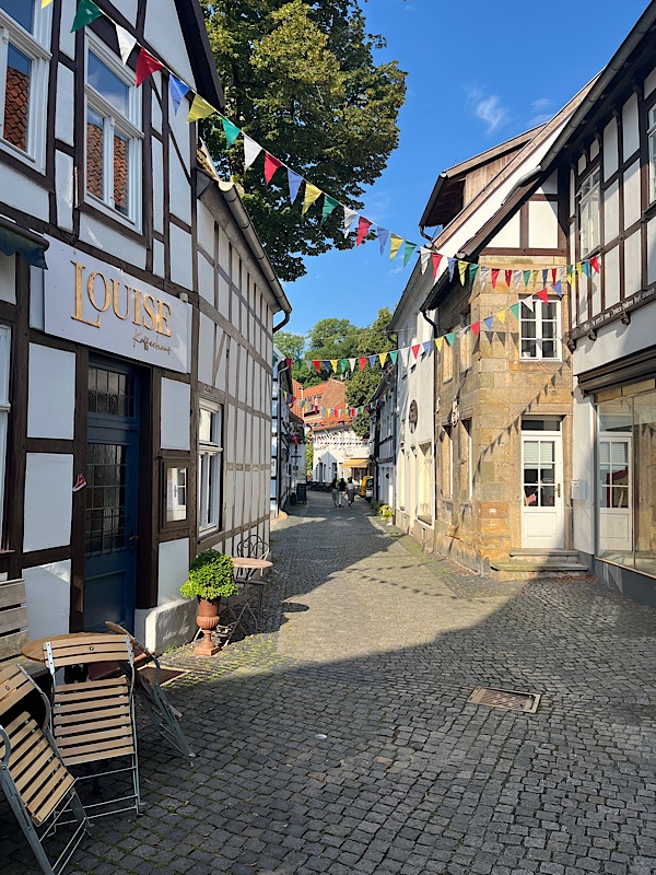 J’arrive au centre-ville de Tecklenburg, fort mignon mais aussi bien désert. Un café me fait penser à mon ami Romain, dont j’ai eu des nouvelles la veille, et à son adorable petite fille.