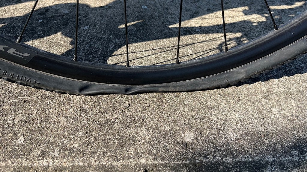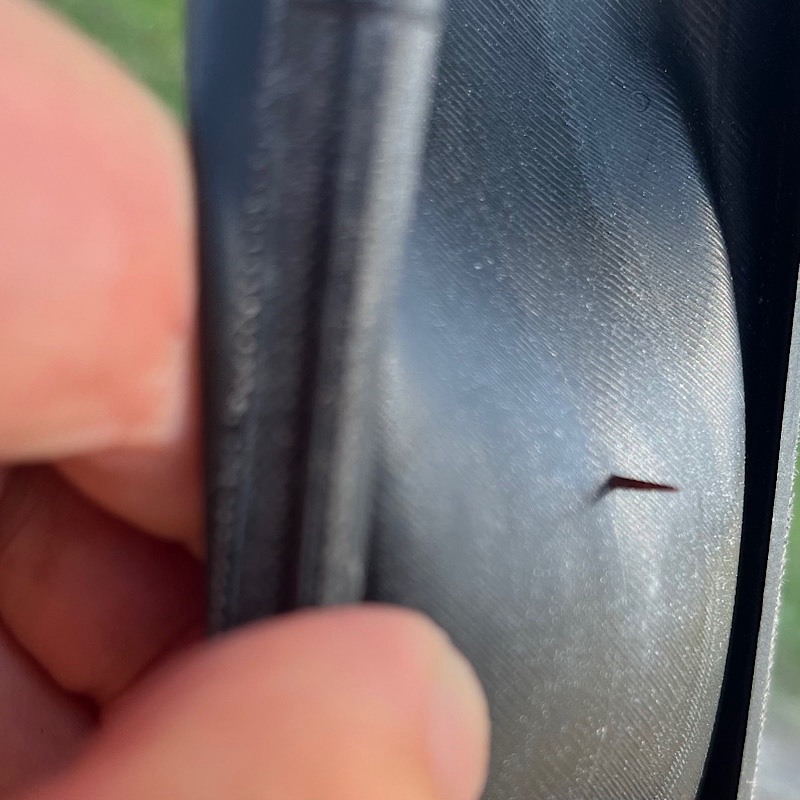 Quand je reviens au logement, j’ai la mauvaise surprise de voir mon pneu arrière de nouveau à plat ; ce qui est bizarre vu que je viens de faire 80 kilomètres avec une rustine sur la chambre.