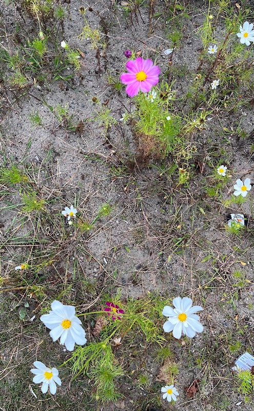 Les fleurs (Cosmos) sont belles et poussent dans un terrain à base de sable, comme aux Pays-Bas !