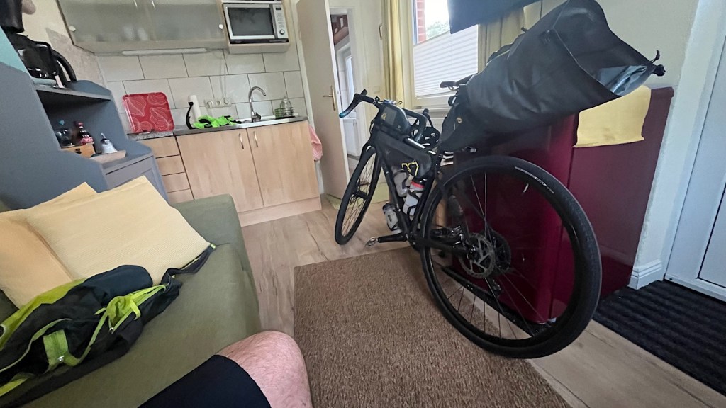 Je roule à travers le village et j’arrive au logement, c’est une Ferienwohnung, soit un espèce de petit appartement. C’est propre, suffisamment spacieux, calme, avec du wifi : en un mot, parfait.