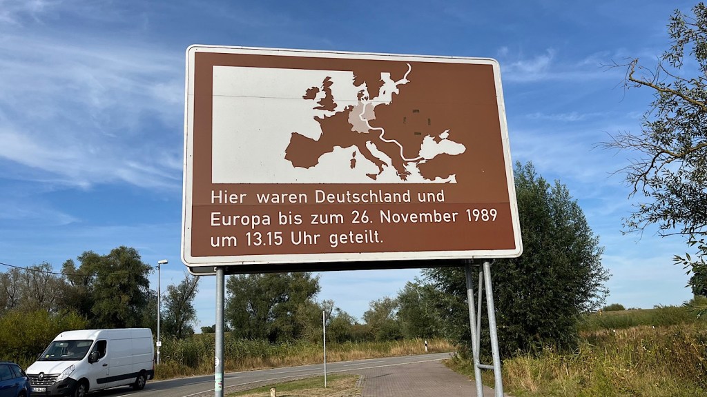 Pour finir, je prends le ferry et je rejoins le village de Bleckede. Un panneau marque la frontière de l’ex-RDA.