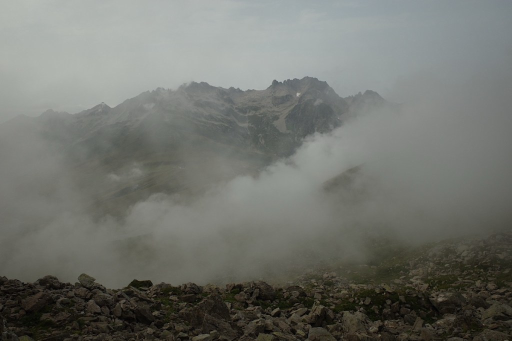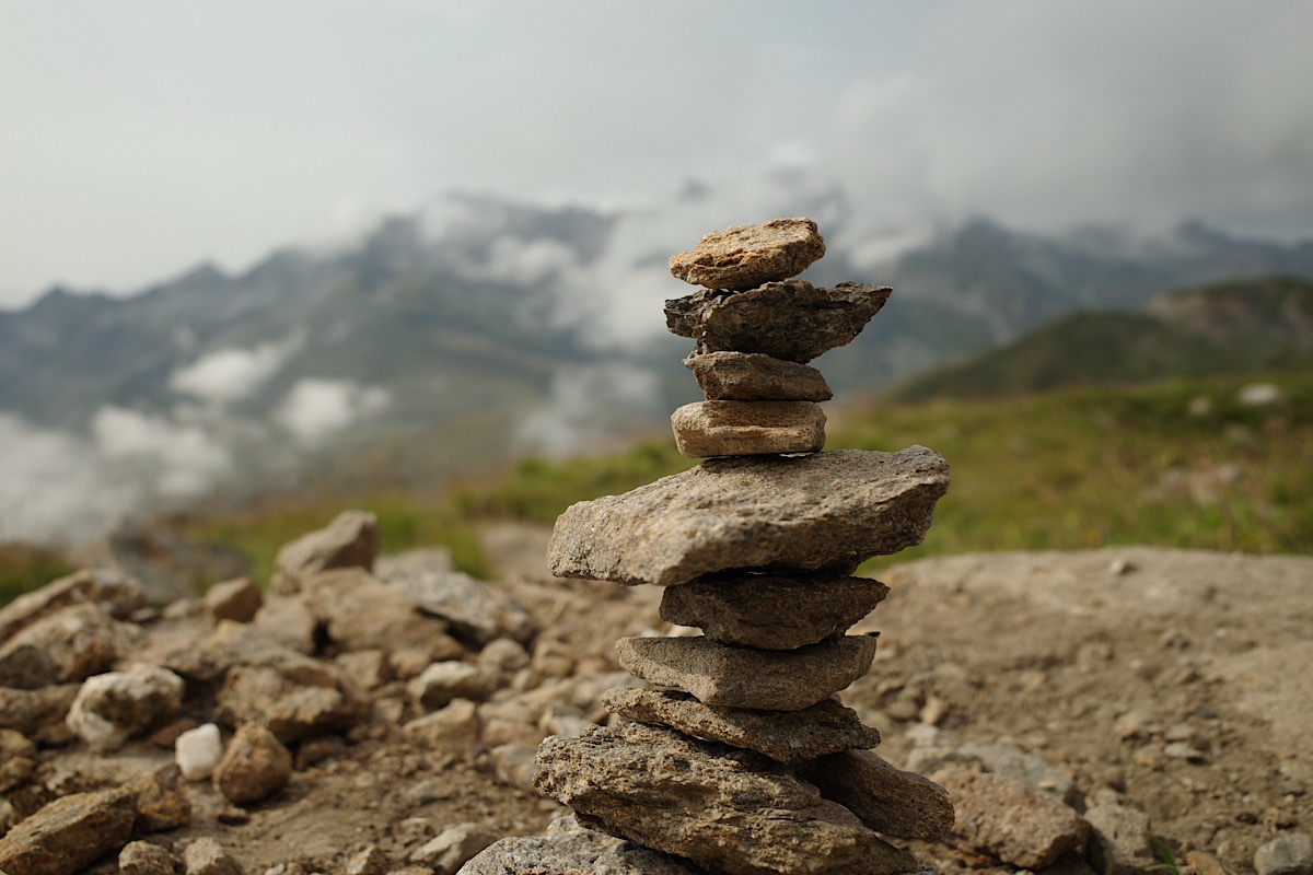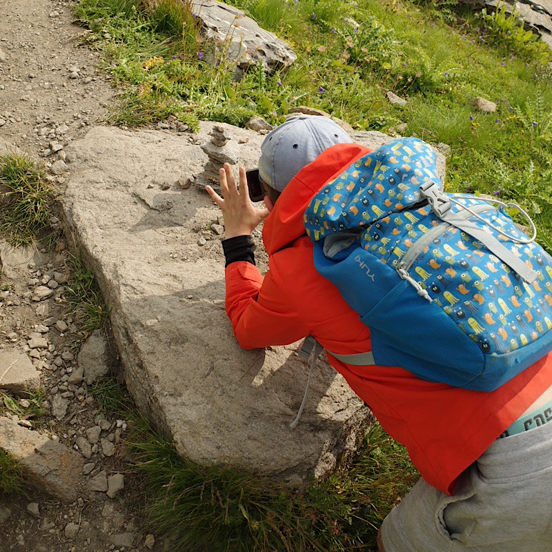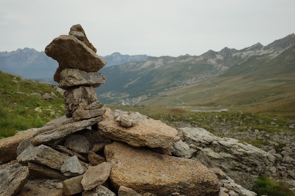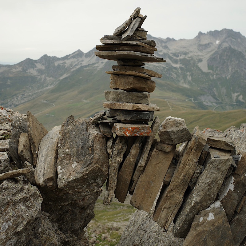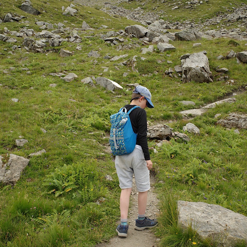 Un gros morceau bien raide nous attend. Mon petit montagnard trouve cela bien difficile et un peu longuet, mais s’occupe en cherchant les cairns et il en construit même un. On croise aussi un randonneur qui redescend du col et qui nous raconte sa vie.