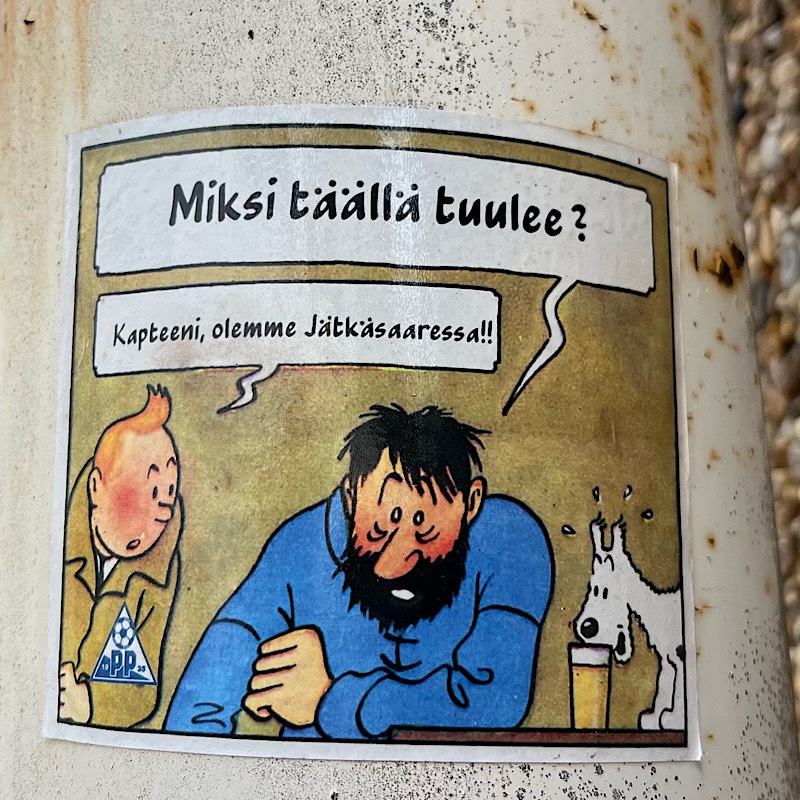 Une fois la visite terminée, nous retournons à la gare et reprenons le train pour Helsinki. Sur le chemin, je trouve une blague sous la forme d’une vignette de Tintin détournée.