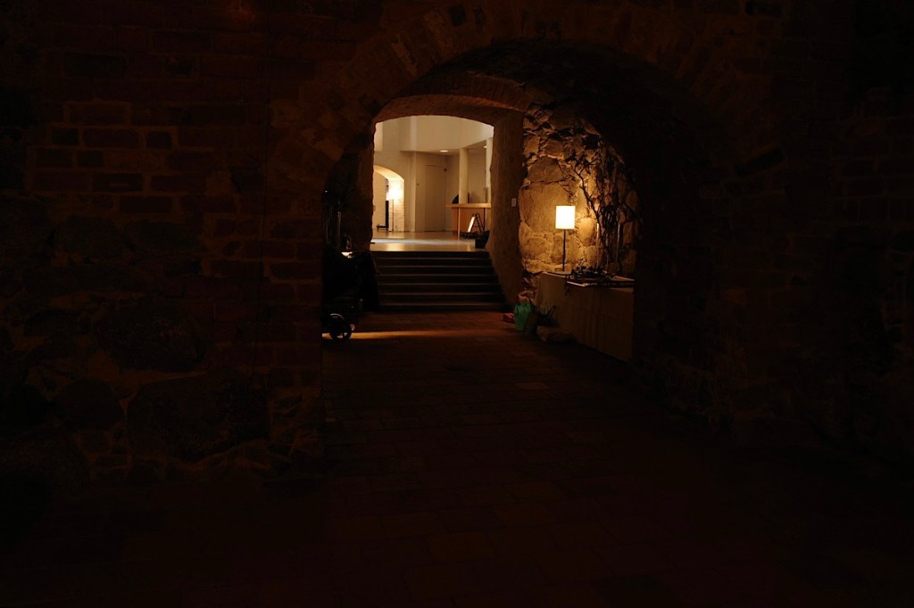 L’intérieur ressemble à l’extérieur : austère. Nos pas résonnent, de salles sombres en couloirs obscurs. À travers les quelques fenêtres, on voit la pluie arroser la ville.