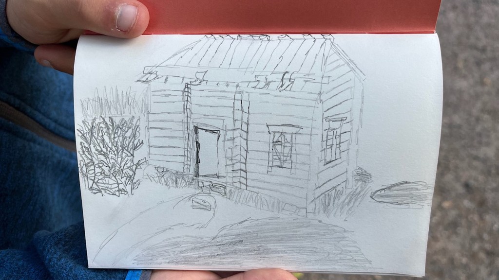 La visite est entrecoupée de longues pauses : lecture et dessin. Car Grogu adore dessiner.