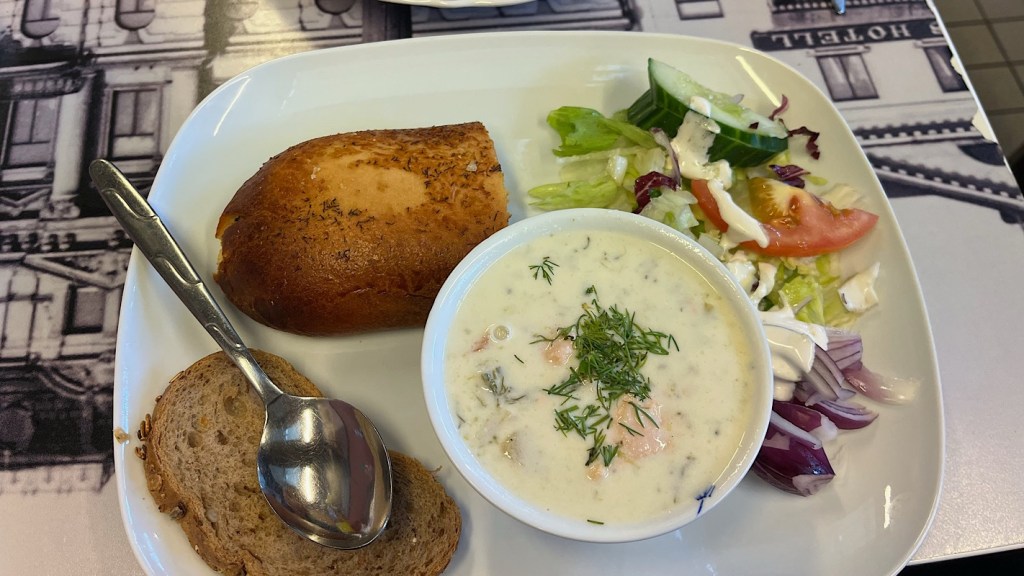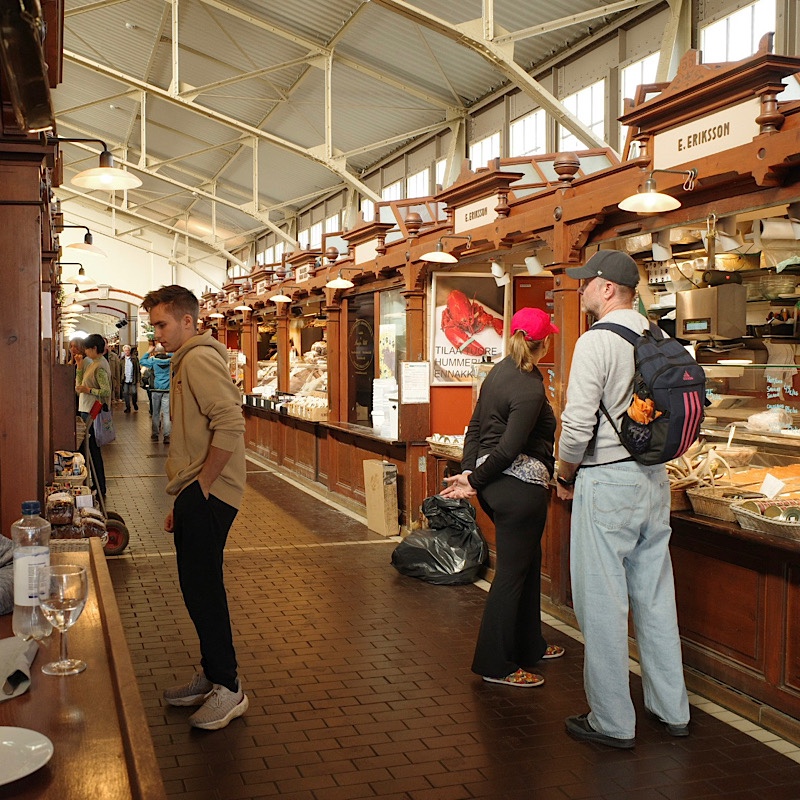 Nous explorons les échoppes du marché ; elles sont toutes en bois patiné et il règne des odeurs de poisson fumé. Après quoi, nous nous attablons dans un petit restaurant. Je prends un morceau de kalakukko (du pain farci au poisson et servi tiède) et un bol de lohikeitto (soupe au saumon crémeuse avec des légumes et de l’aneth). Peu enclin à prendre des risques, Grogu choisit une pita avec des falafels et des frites.
